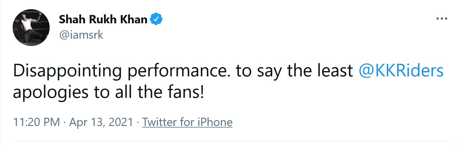 कोलकाता नाइट राइडर्स की इस हार के बाद टीम के मालिक शाहरुख खान ट्विटर पर जमकर भड़के हैं. शाहरुख खान ने कोलकाता नाइट राइडर्स के इस खराब प्रदर्शन के बाद फैंस से ट्विटर पर माफी मांगी है. कोलकाता नाइट राइडर्स की इस हार के बाद शाहरुख खान ने ट्विटर पर लिखा, 'निराशाजनक प्रदर्शन, इतना ही कह सकता हूं केकेआर फैन्स से कि माफ करिए.'